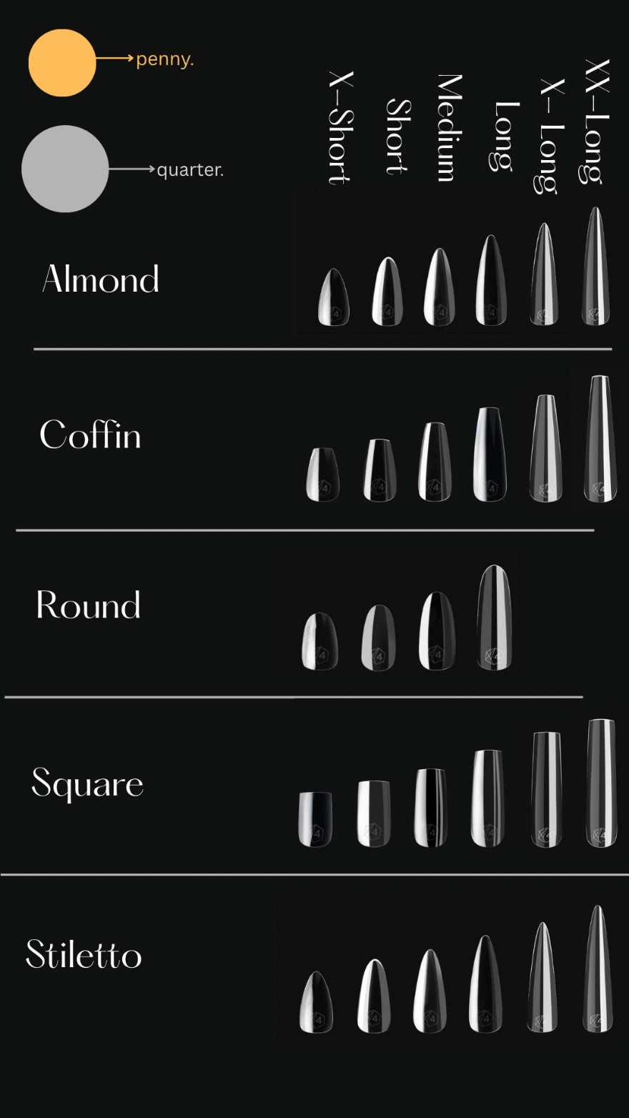 - Match the pictured nail to the width of your natural nail to determine the length you prefer.