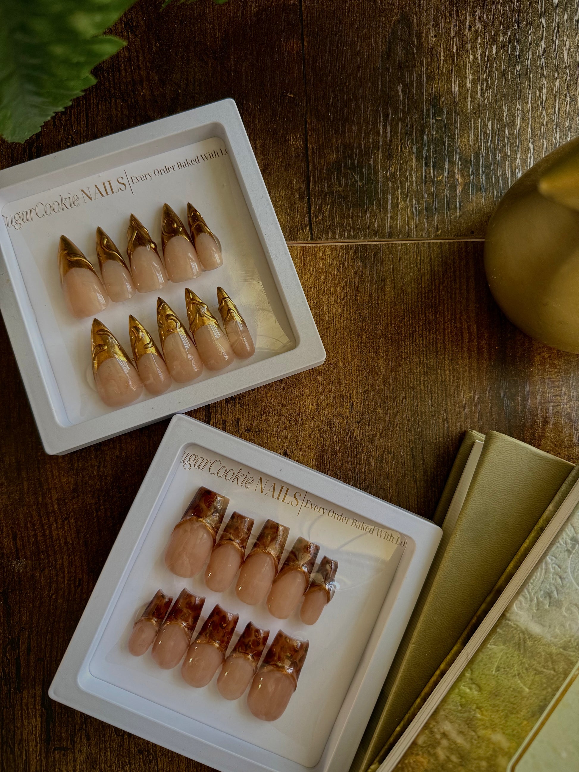 Layered Cheetah Print with a Brown Overlay, Gold Sparkle French 3D Line and a Nude Base.